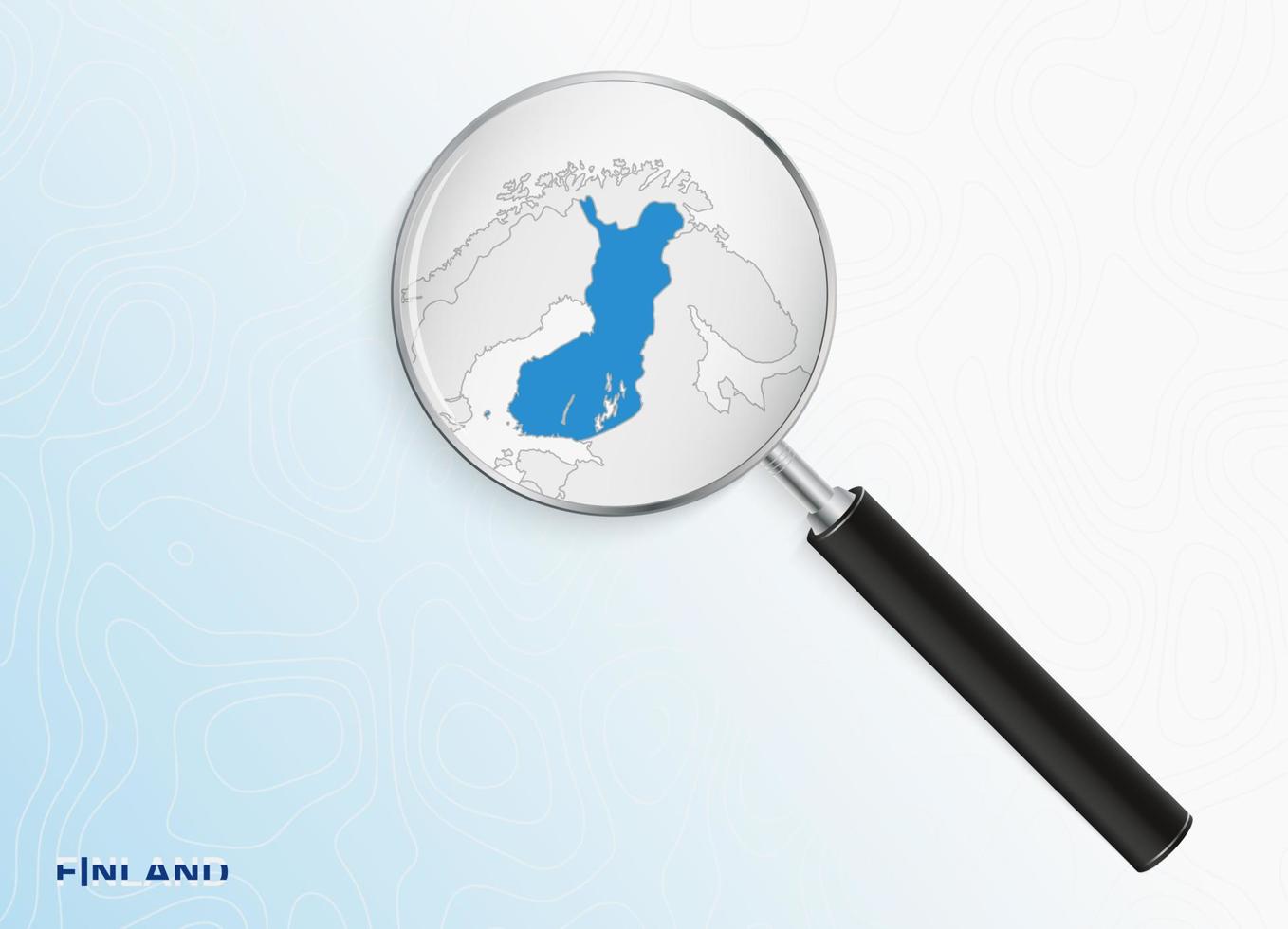 Magnifier with map of Finland on abstract topographic background. Pro Vector