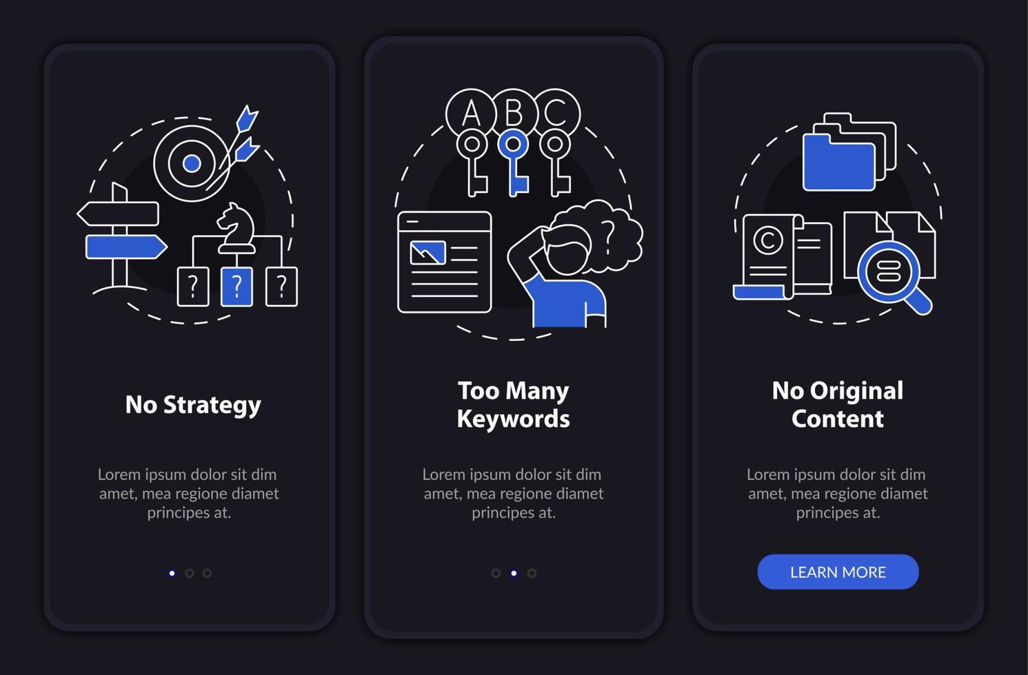 Search engine optimization mistakes night mode onboarding mobile app screen. Walkthrough 3 steps editable instructions with linear concepts. UI, UX, GUI template. Pro Vector