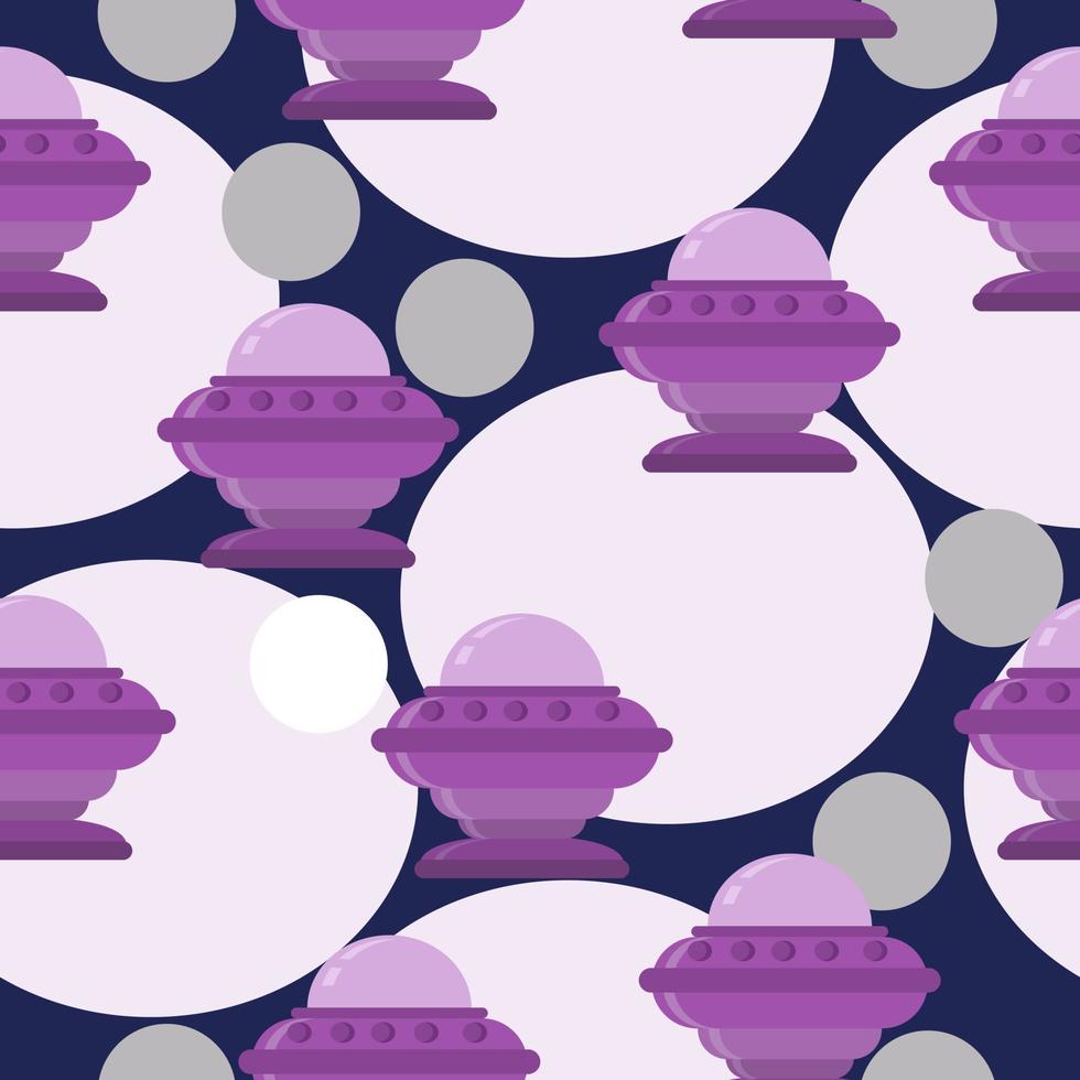 Seamless pattern of UFO spaceships in purple shades in cartoon style, flying objects and abstract circles on a deep blue background Pro Vector