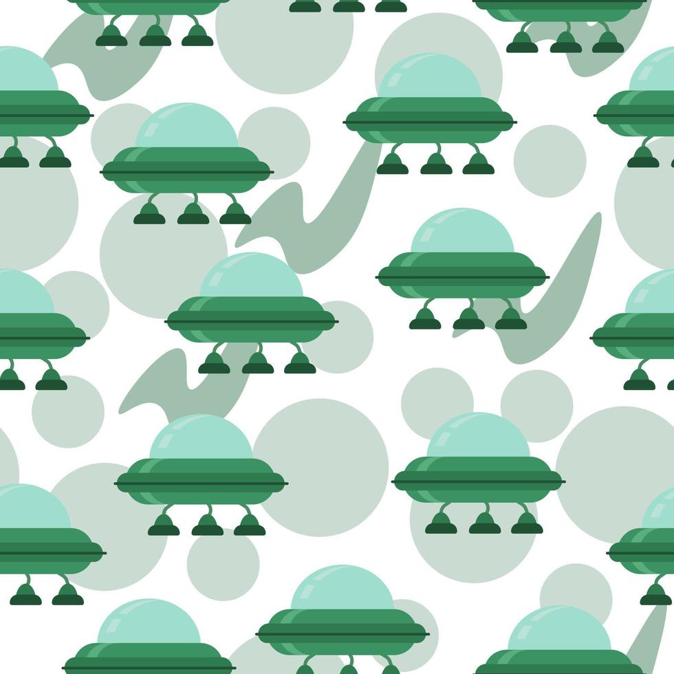 Seamless pattern of UFO spaceships in green shades in cartoon style, flying objects and abstract circles on a white background Pro Vector