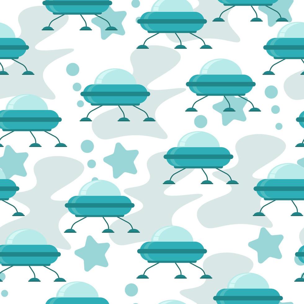 Seamless pattern of UFO spaceships in blue shades in cartoon style, flying objects and abstract spots on a white background Pro Vector