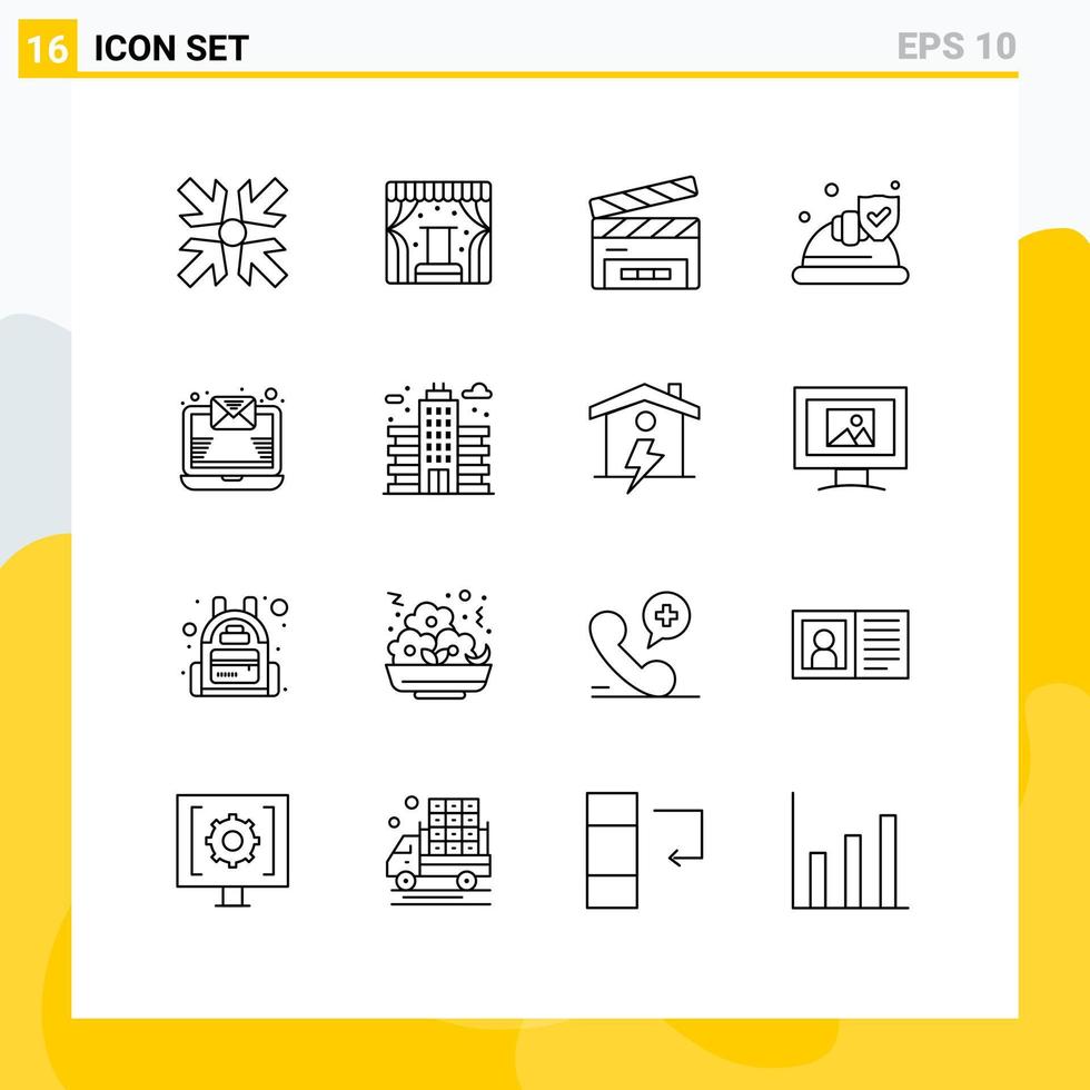 Pictogram Set of 16 Simple Outlines of newsletter email clapper shield insurance Editable Vector Design Elements