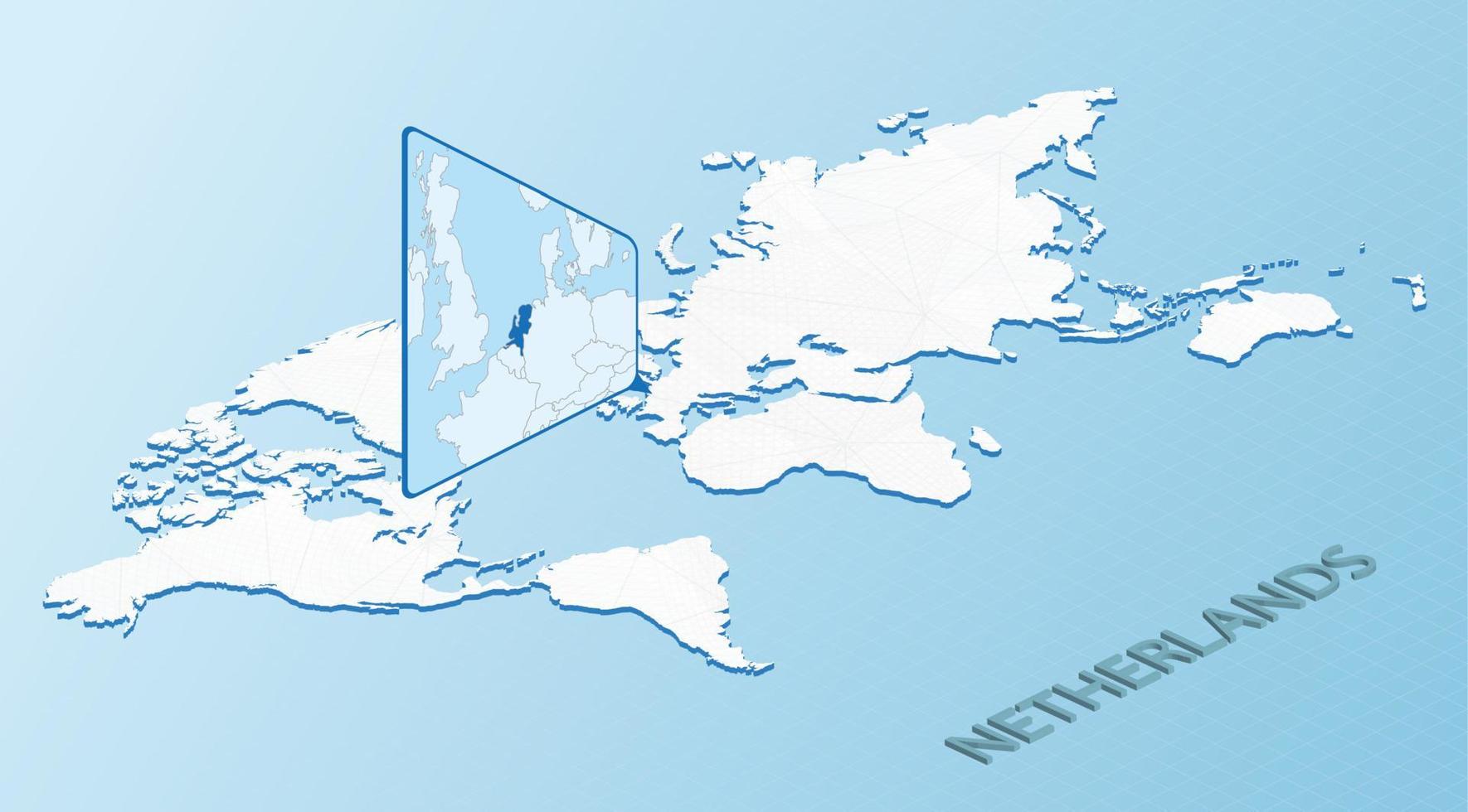 World Map in isometric style with detailed map of Netherlands. Light blue Netherlands map with abstract World Map. Pro Vector