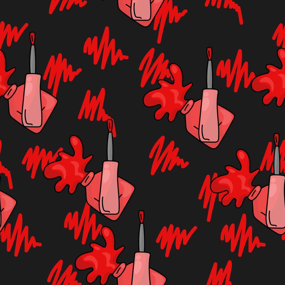 Seamless pattern of red bottles with nail polish, bright splashes and strokes on a dark gray background Pro Vector