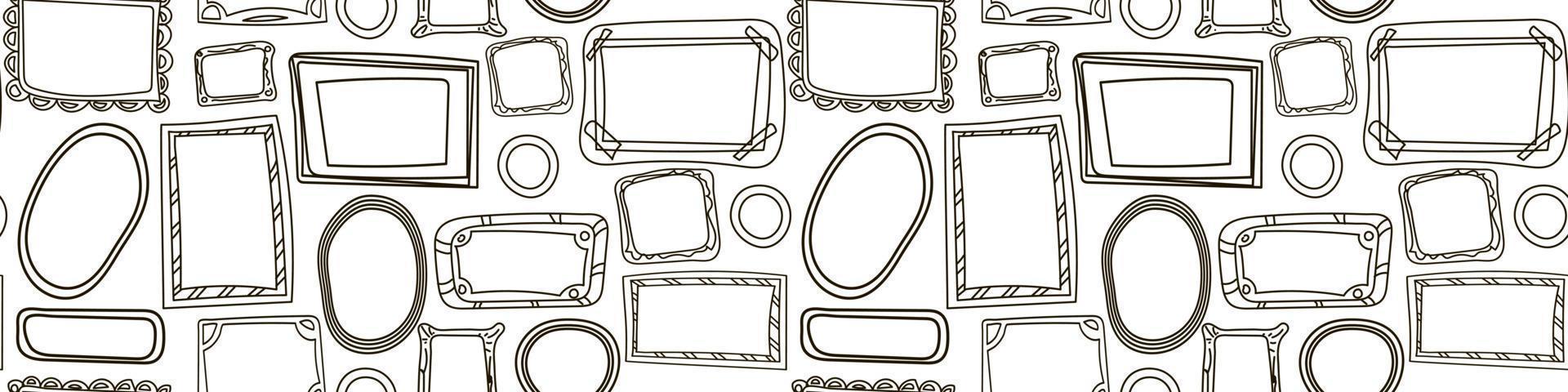 A pattern of doodle-style frames. Black outline on a white background. Suitable for printing on paper and textiles. Repeating frames. Gift wrapping. Stylish print. Mix, horizontal arrangement. Pro Vector