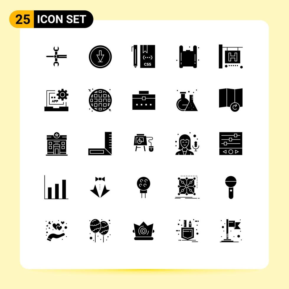 Pack of 25 Modern Solid Glyphs Signs and Symbols for Web Print Media such as gas development down develop coding Editable Vector Design Elements