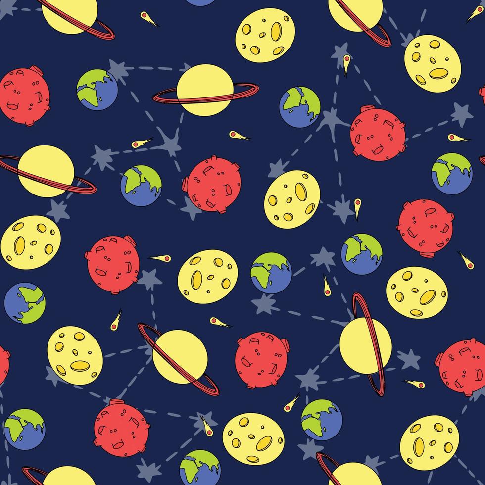 Seamless pattern with any planets and another space elements. Vector illustration. Pro Vector
