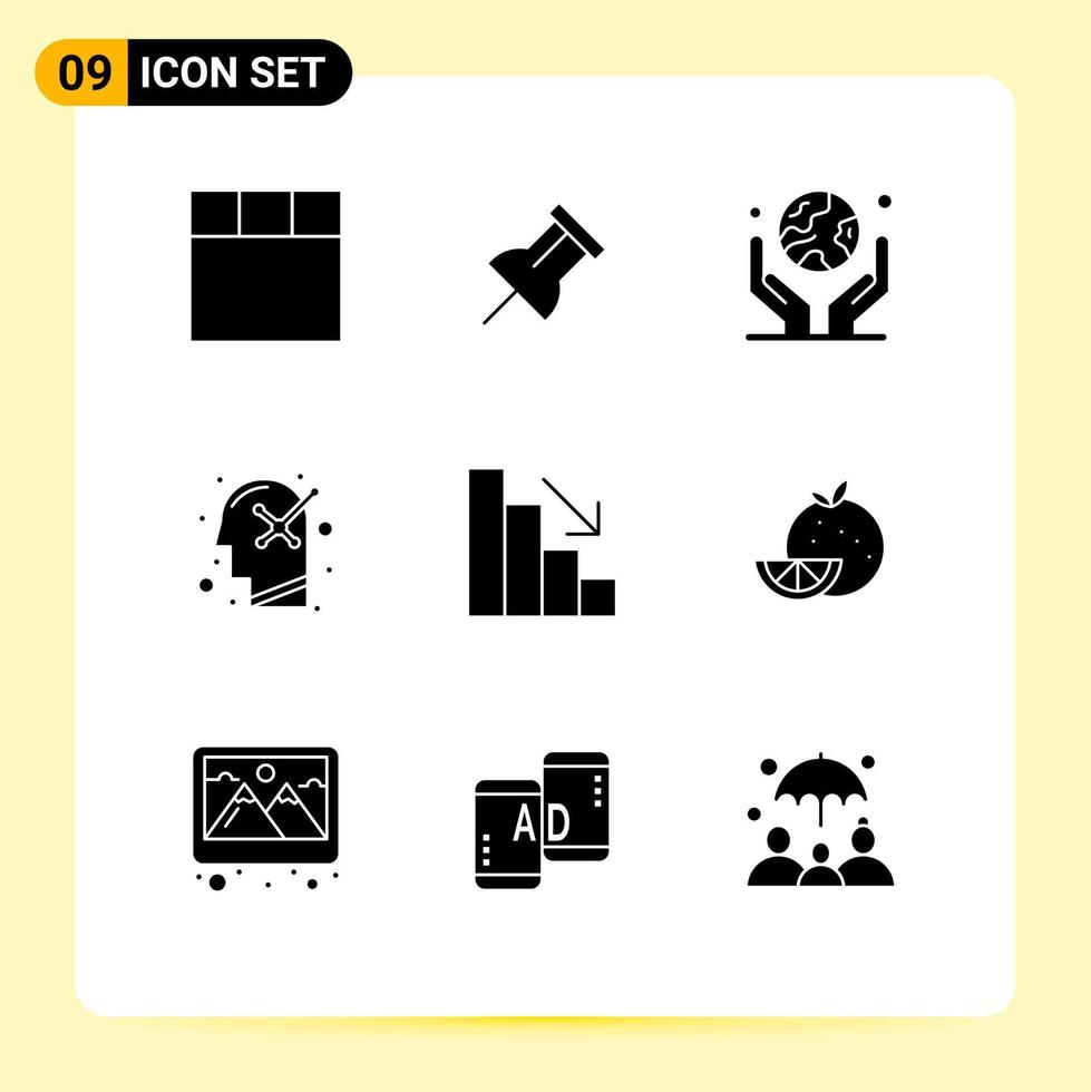 Pack of 9 Modern Solid Glyphs Signs and Symbols for Web Print Media such as orange descent planet analytics psychology Editable Vector Design Elements