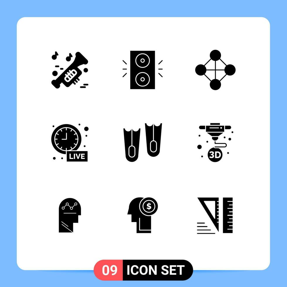 Pack of 9 Modern Solid Glyphs Signs and Symbols for Web Print Media such as marine diving hierarchy live update clock Editable Vector Design Elements
