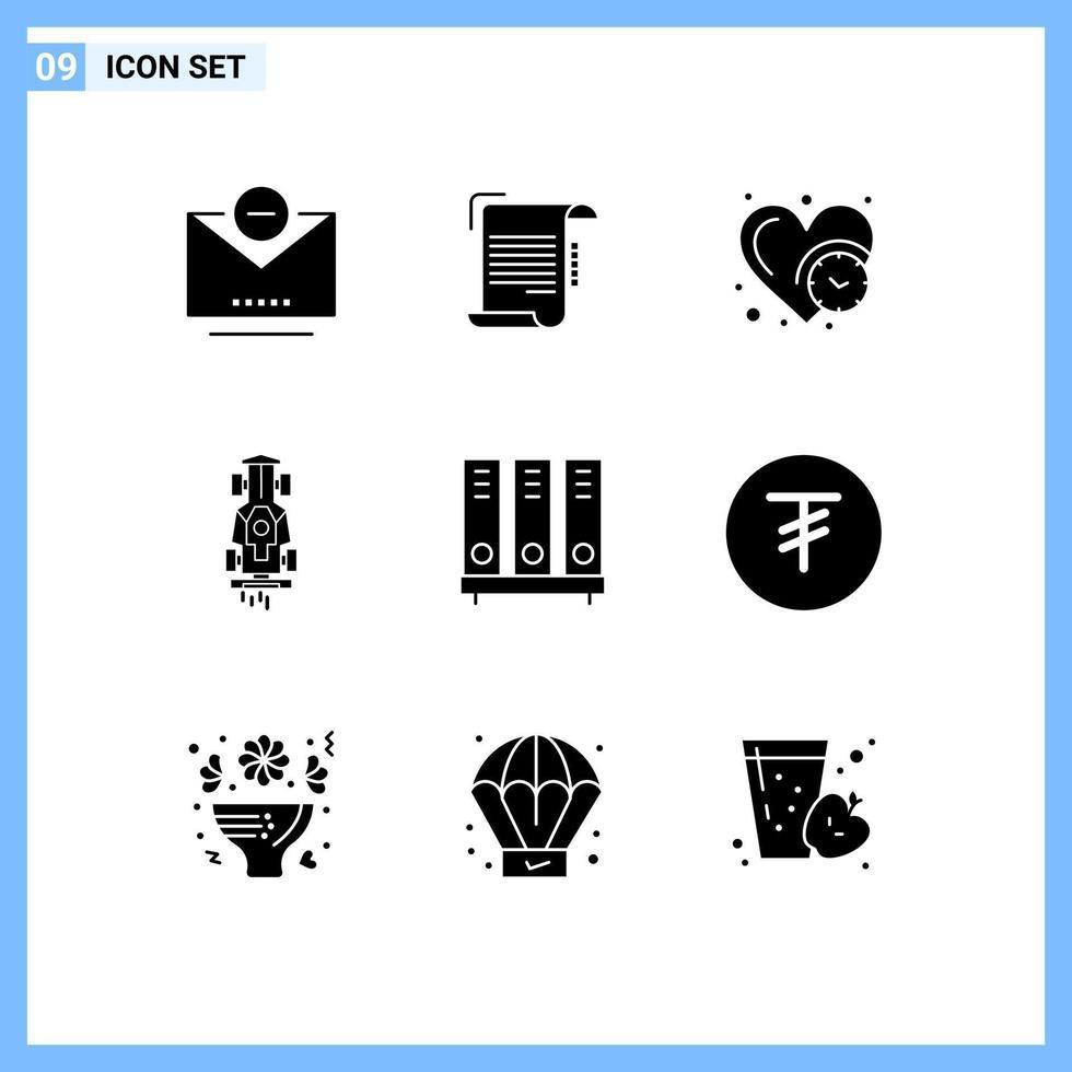 Pictogram Set of 9 Simple Solid Glyphs of archive racing clock game car Editable Vector Design Elements