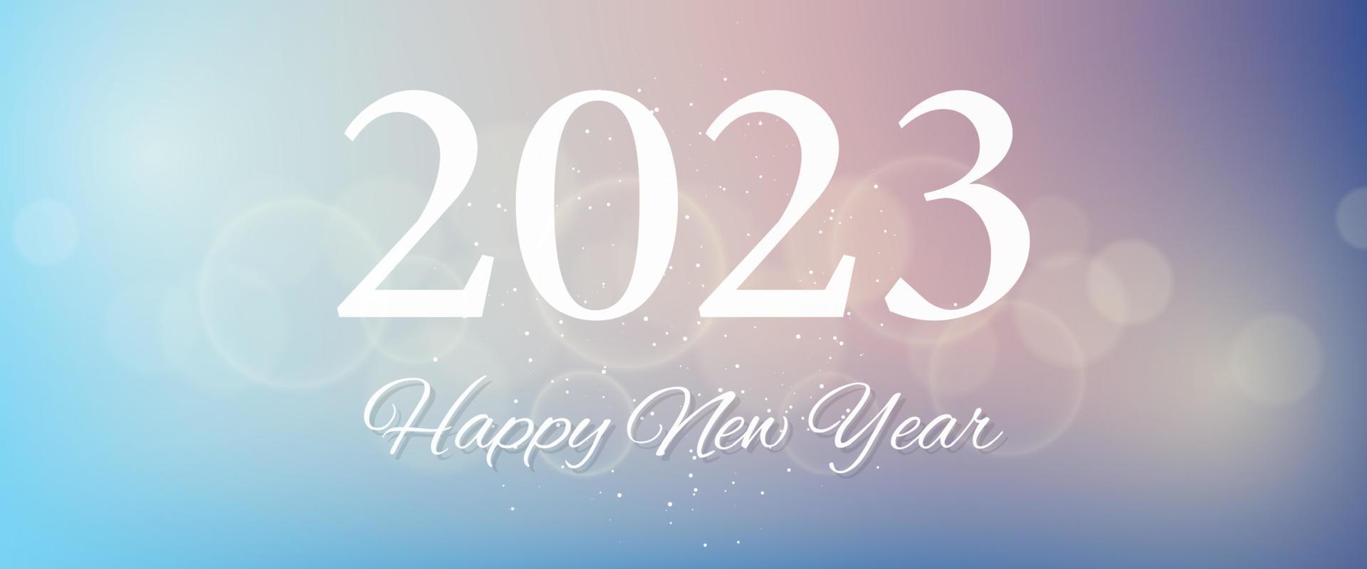Happy new year 2023 incription on blurred background. White numbers on backdrop with confetti, bokeh and lens flare. Vector illustration Pro Vector
