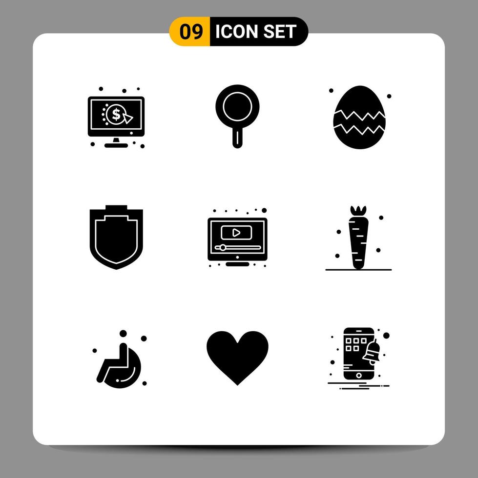 Pack of 9 Modern Solid Glyphs Signs and Symbols for Web Print Media such as youtube play egg computer security Editable Vector Design Elements