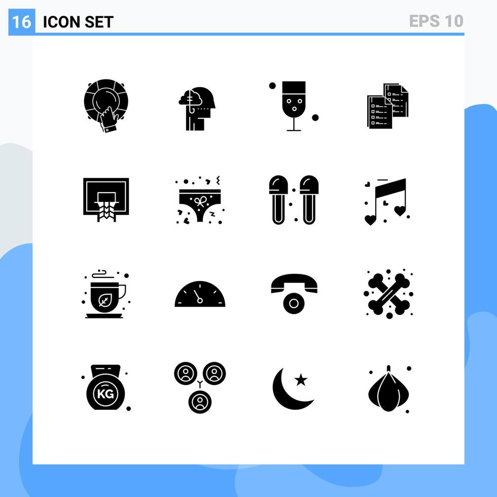 Universal Icon Symbols Group of 16 Modern Solid Glyphs of data document habit glass drinking Editable Vector Design Elements