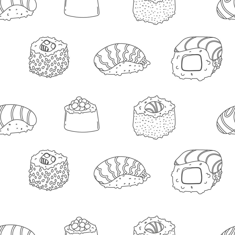 Seamless pattern from sketches of sushi and rolls. Linear, minimalistic background. Sushi with avocado and salmon, rolls, wasabi, ginger. Pro Vector