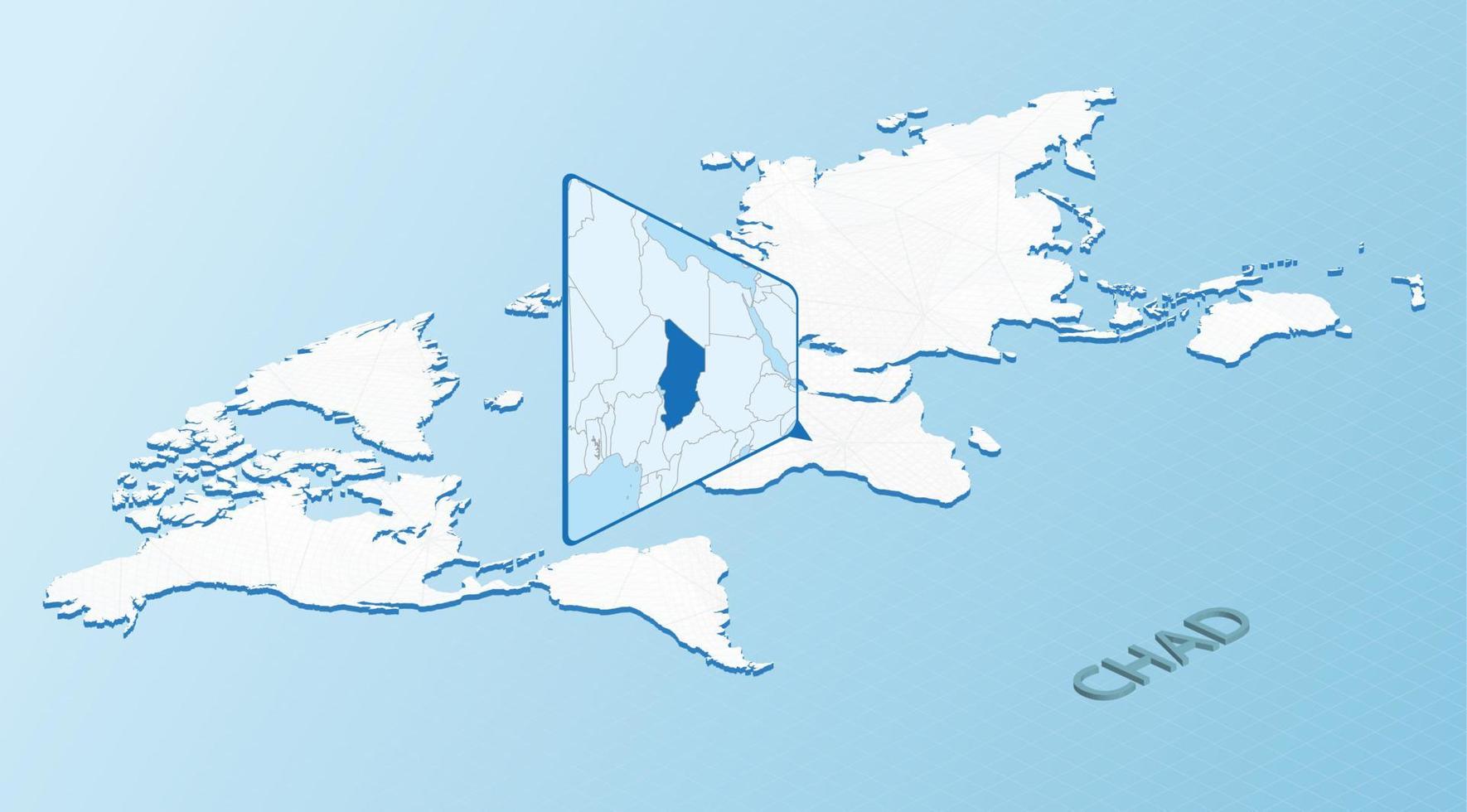 World Map in isometric style with detailed map of Chad. Light blue Chad map with abstract World Map. Pro Vector