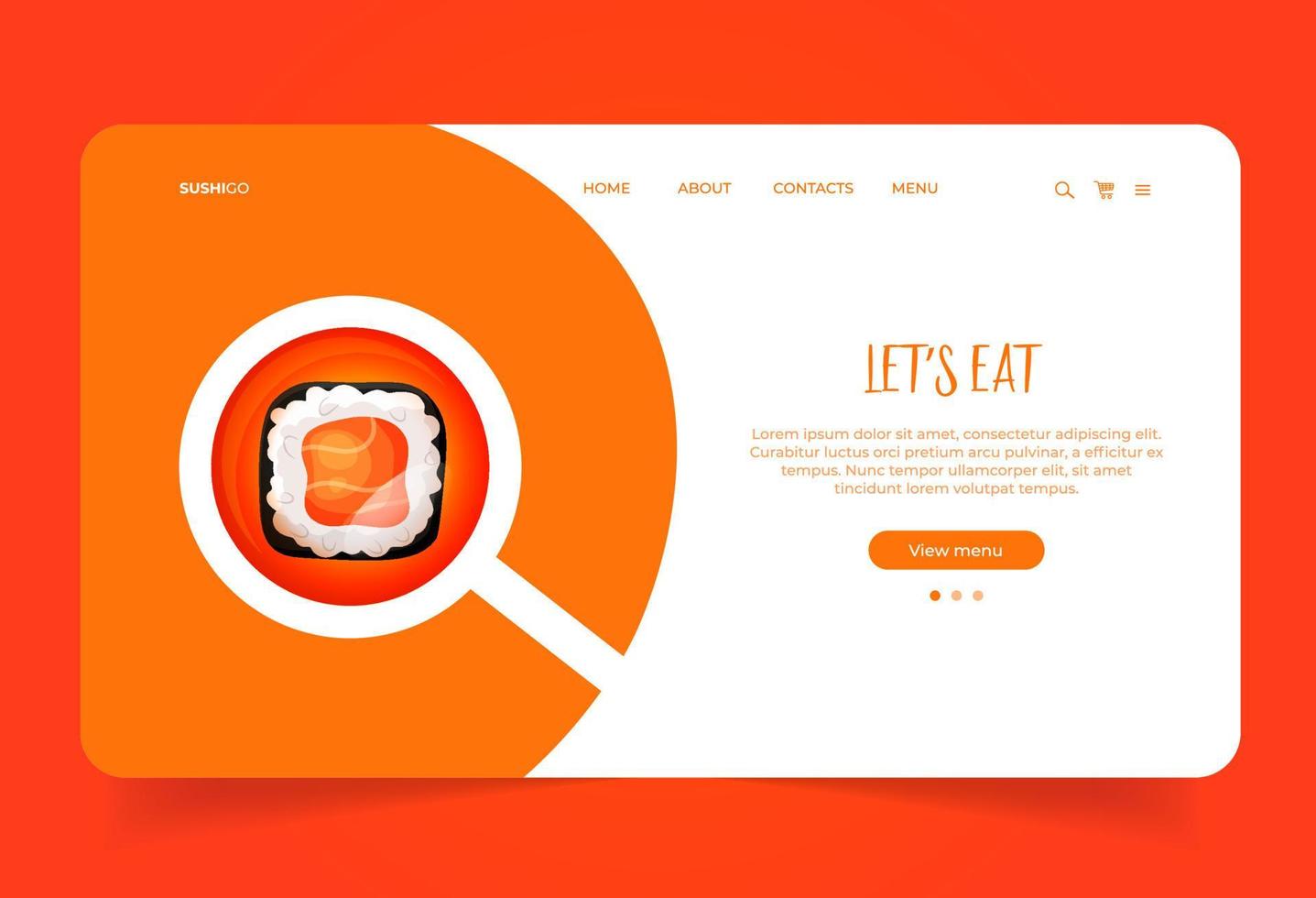 Landing page with sushi roll with salmon under the magnifying glass. Web site for business company Pro Vector