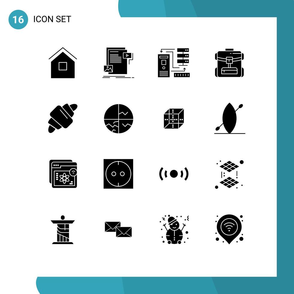 Pack of 16 Modern Solid Glyphs Signs and Symbols for Web Print Media such as service bag media information database Editable Vector Design Elements