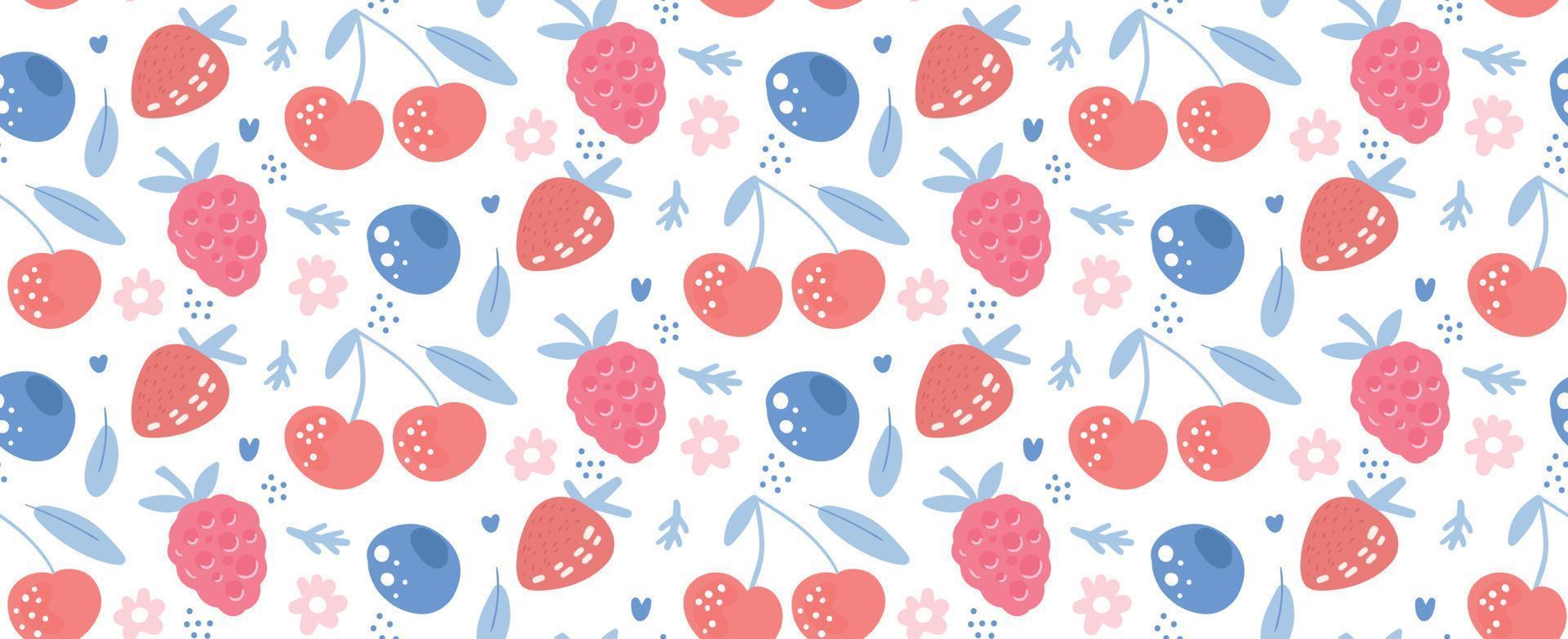 Vector Hand drawn seamless pattern of berries mix with leaves and flowers on a white background. Abstract modern Elements of summer berries for print, product design, menu and posters Pro Vector