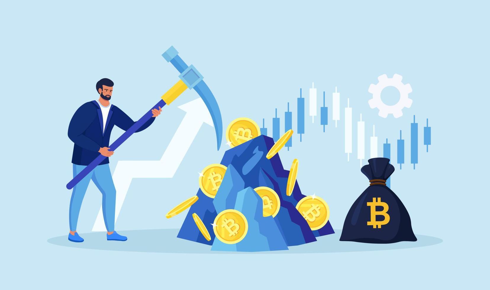 Man holding pickaxe to get crypto coins in rock, mountain. Mining crypto, Cryptocurrency mining farms. People trading and investing in cryptocurrencies. Digital web money. Blockchain Pro Vector