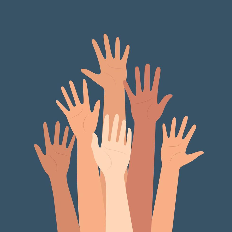 Multicultural crowd of people with hands up, teamwork of multinational team. Teamwork, friendship, unity, help, volunteering concept. Vector illustration. Pro Vector