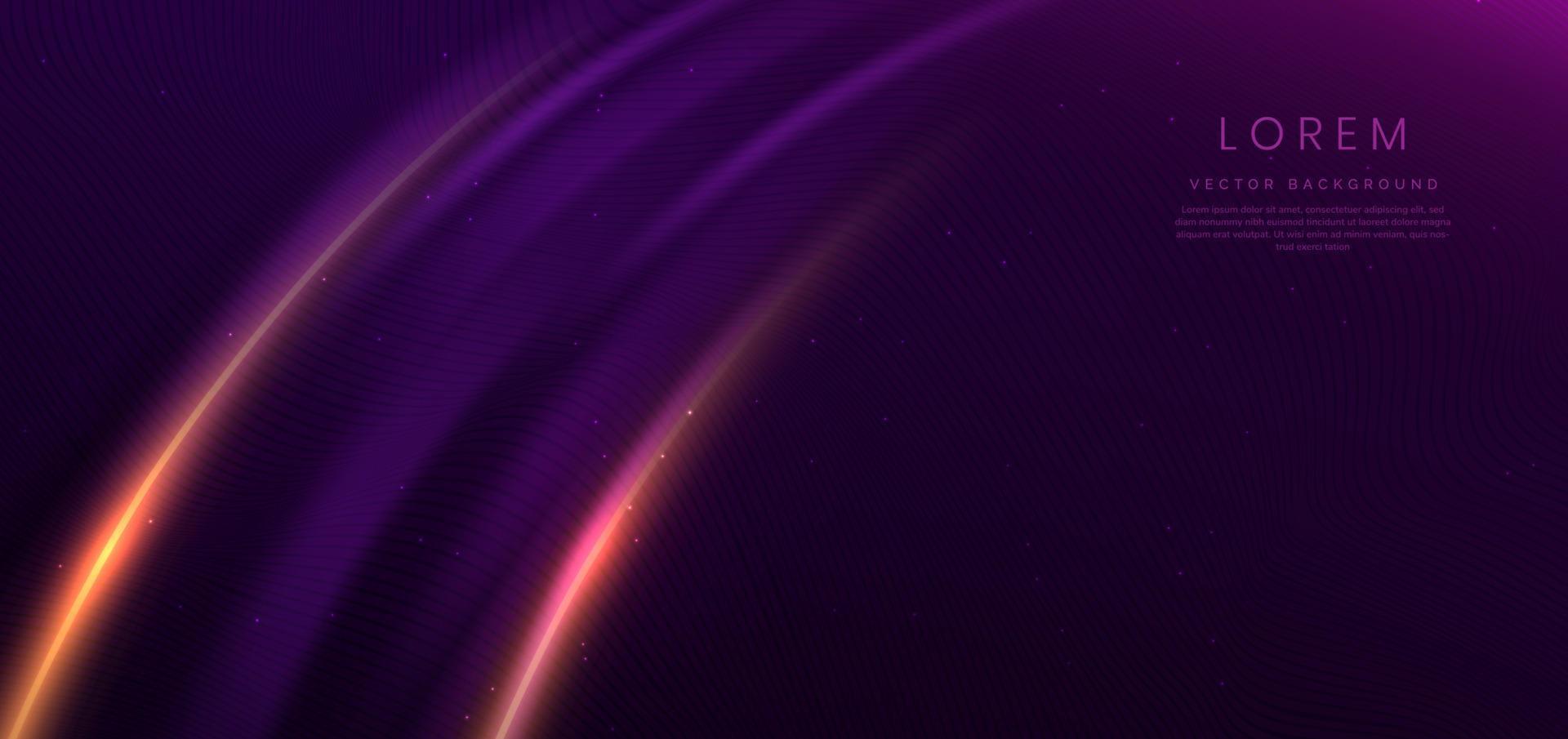 Abstract glowing gold curved lines on dark purple background with lighting effect and sparkle with copy space for text. vector