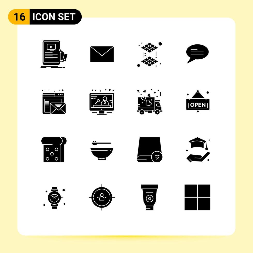 Pack of 16 Modern Solid Glyphs Signs and Symbols for Web Print Media such as online email cube browser conversation Editable Vector Design Elements