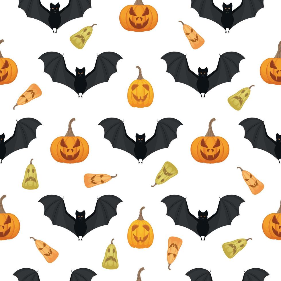 A bright seamless pattern with the image of jack-o - lanterns and black bats. A pattern with Halloween symbols. Pattern for a print with pumpkins. Vector illustration Pro Vector
