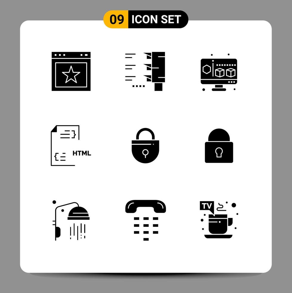 Group of 9 Modern Solid Glyphs Set for locked internet gadget html development Editable Vector Design Elements