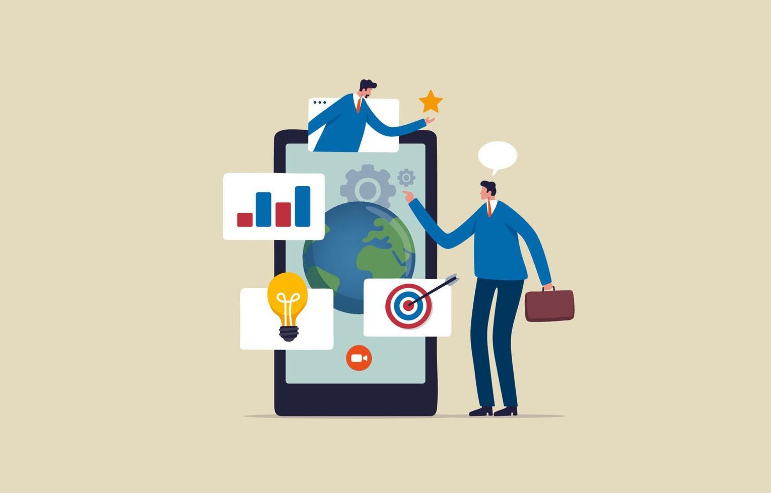 Business global internet connection application technology and digital marketing. Businessman communicating with mobile app on linktech big data. Illustration Pro Vector
