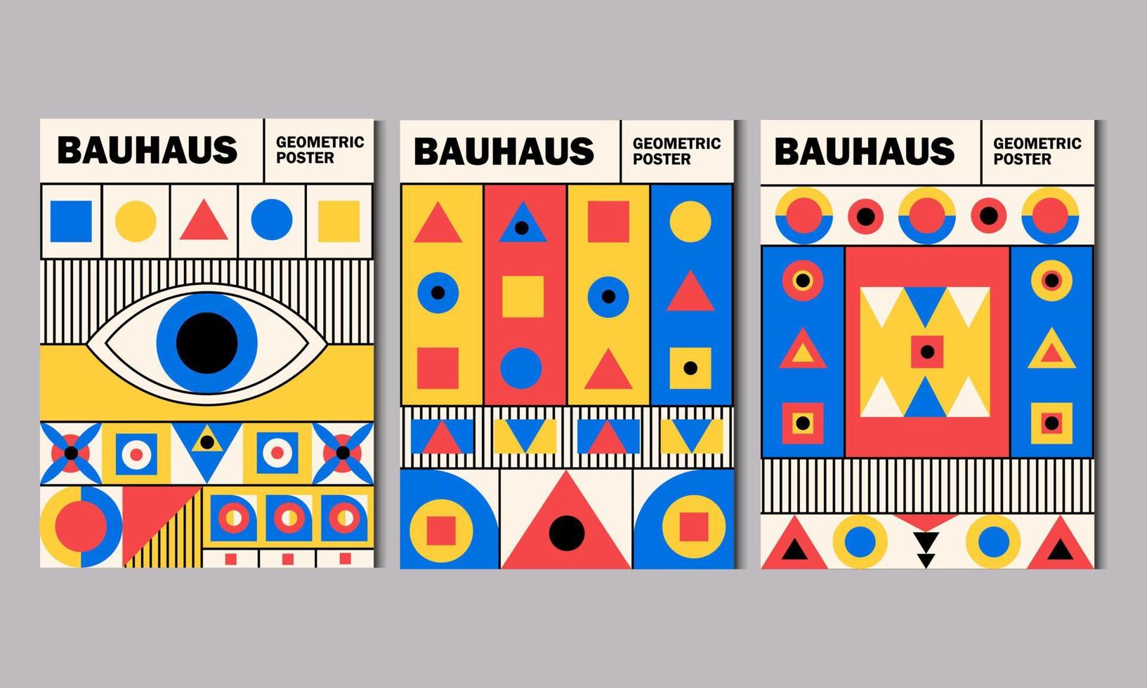Geometric posters. Bauhaus cover templates with abstract geometry. Retro architecture minimal shapes, forms, lines and eye design vector set. Pro Vector