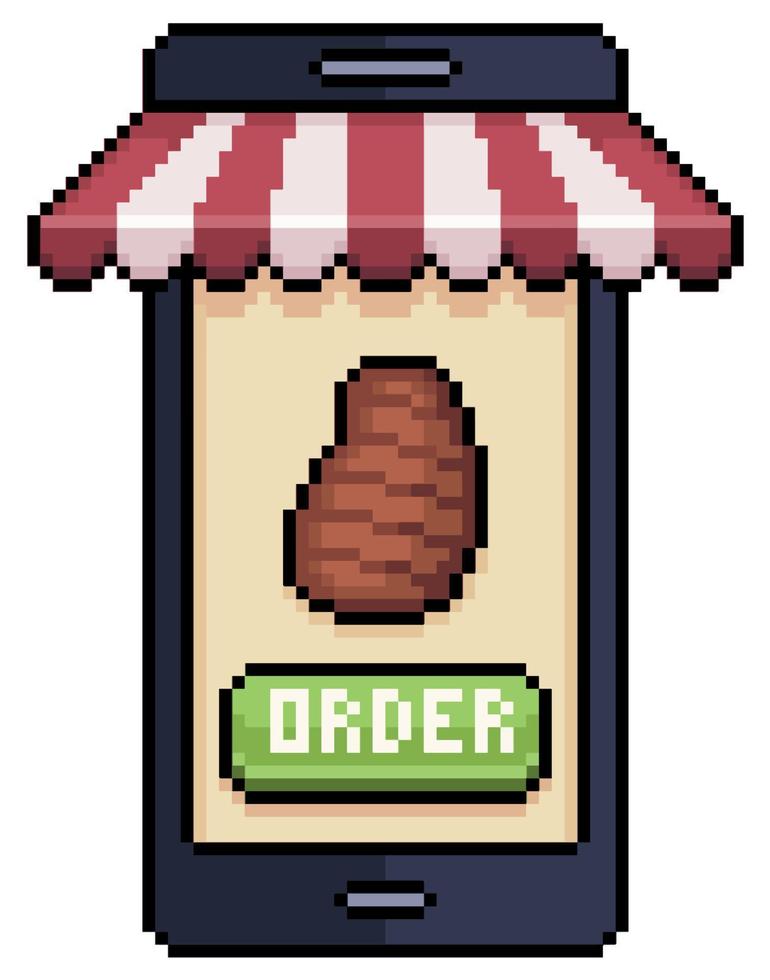 Pixel art mobile phone ordering meat in food app vector icon for 8bit game on white background Pro Vector