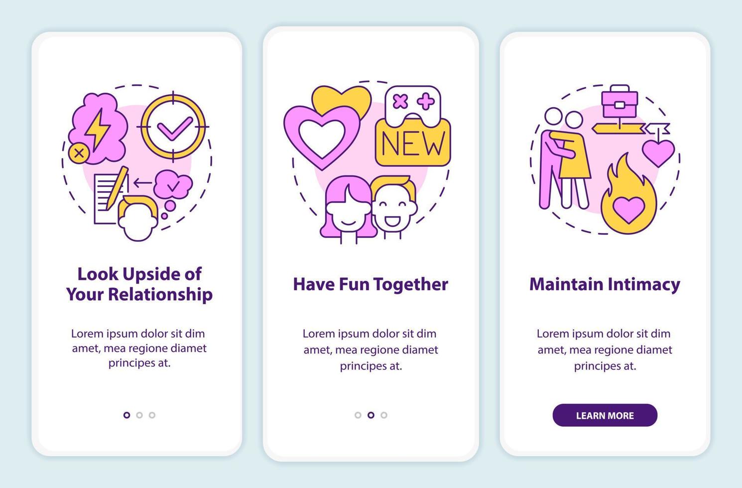When you arent feeling it onboarding mobile app screen. Intimacy walkthrough 3 steps editable graphic instructions with linear concepts. UI, UX, GUI template. Pro Vector