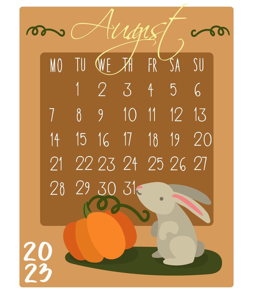 Calendar for the month with rabbits for 2023. Rabbit in August. Calendar month for printing on paper and textiles. Banner, leaflet, postcard. Pro Vector