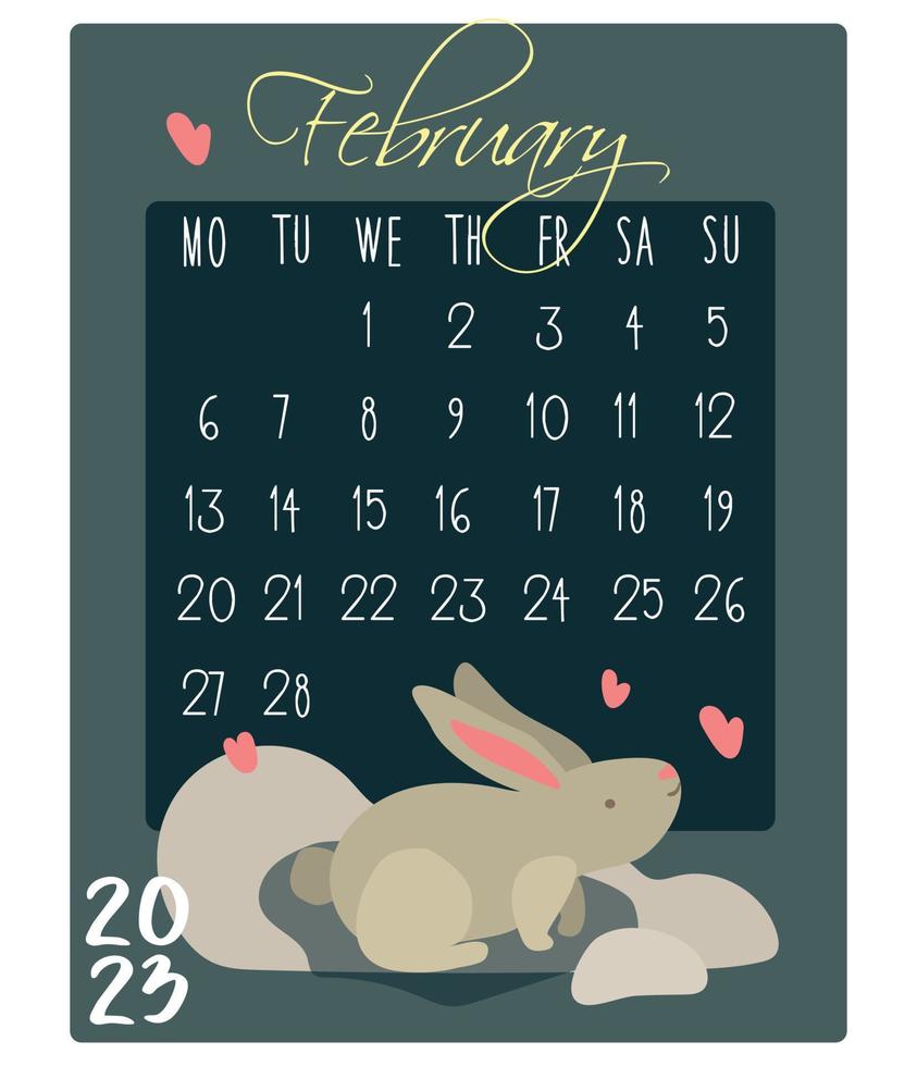 Calendar for the month with rabbits for 2023. Rabbit in February. Calendar month for printing on paper and textiles. Banner, leaflet, postcard. Pro Vector