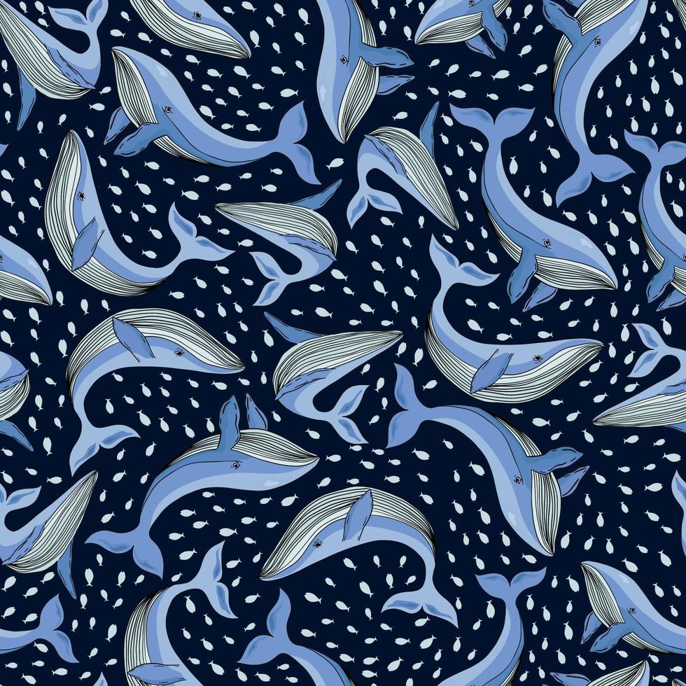 Seamless repeating simple flat pattern with whales and fish. Pattern for kids with whales. Pro Vector