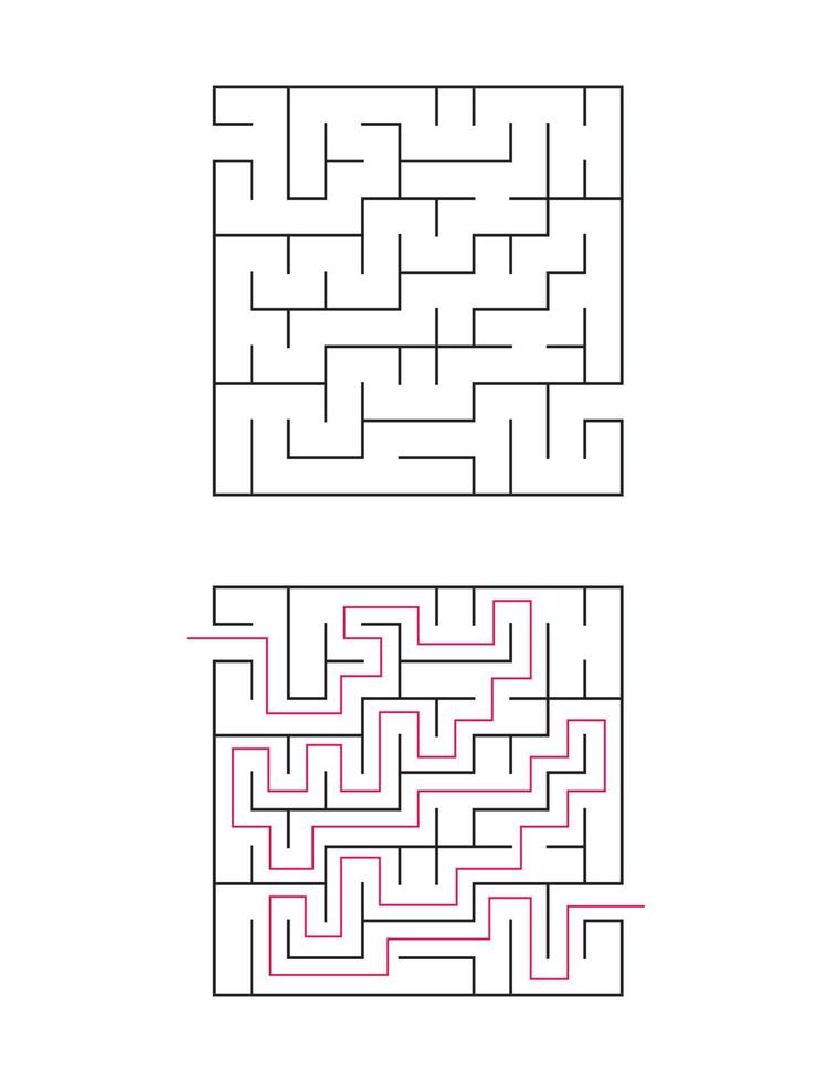 The square maze has an entrance and an exit. Maze with the answer, the path of passage Pro Vector