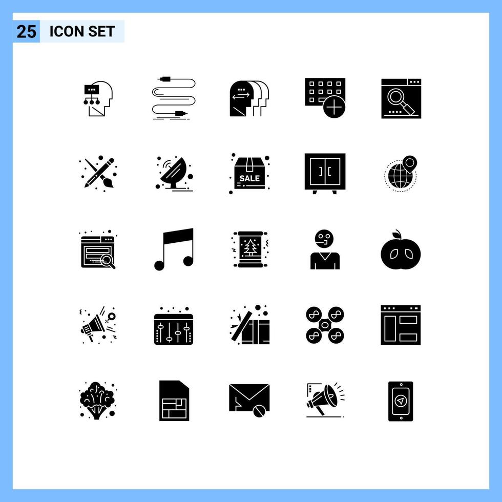 Pack of 25 Modern Solid Glyphs Signs and Symbols for Web Print Media such as hardware devices wire computers head Editable Vector Design Elements