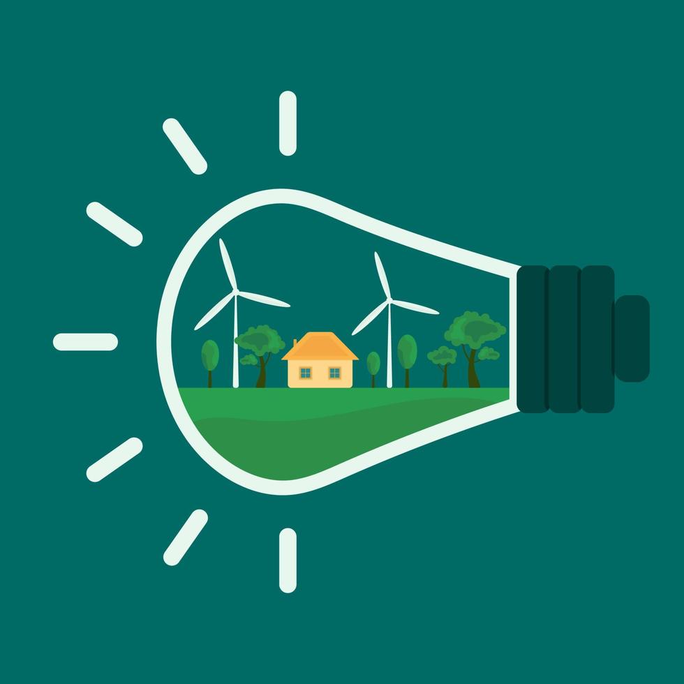 icon, sticker, button on the theme of saving and renewable energy with landscape with house, trees, clouds, wind turbines inside bulb. Pro Vector