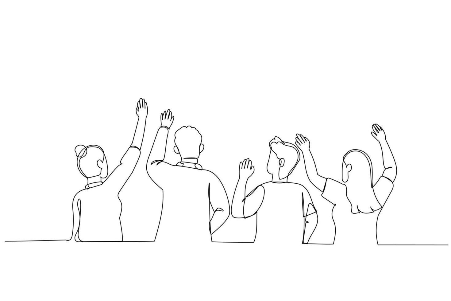 Illustration of group of people looking up and pointing with fingers. Single continuous line art style Pro Vector