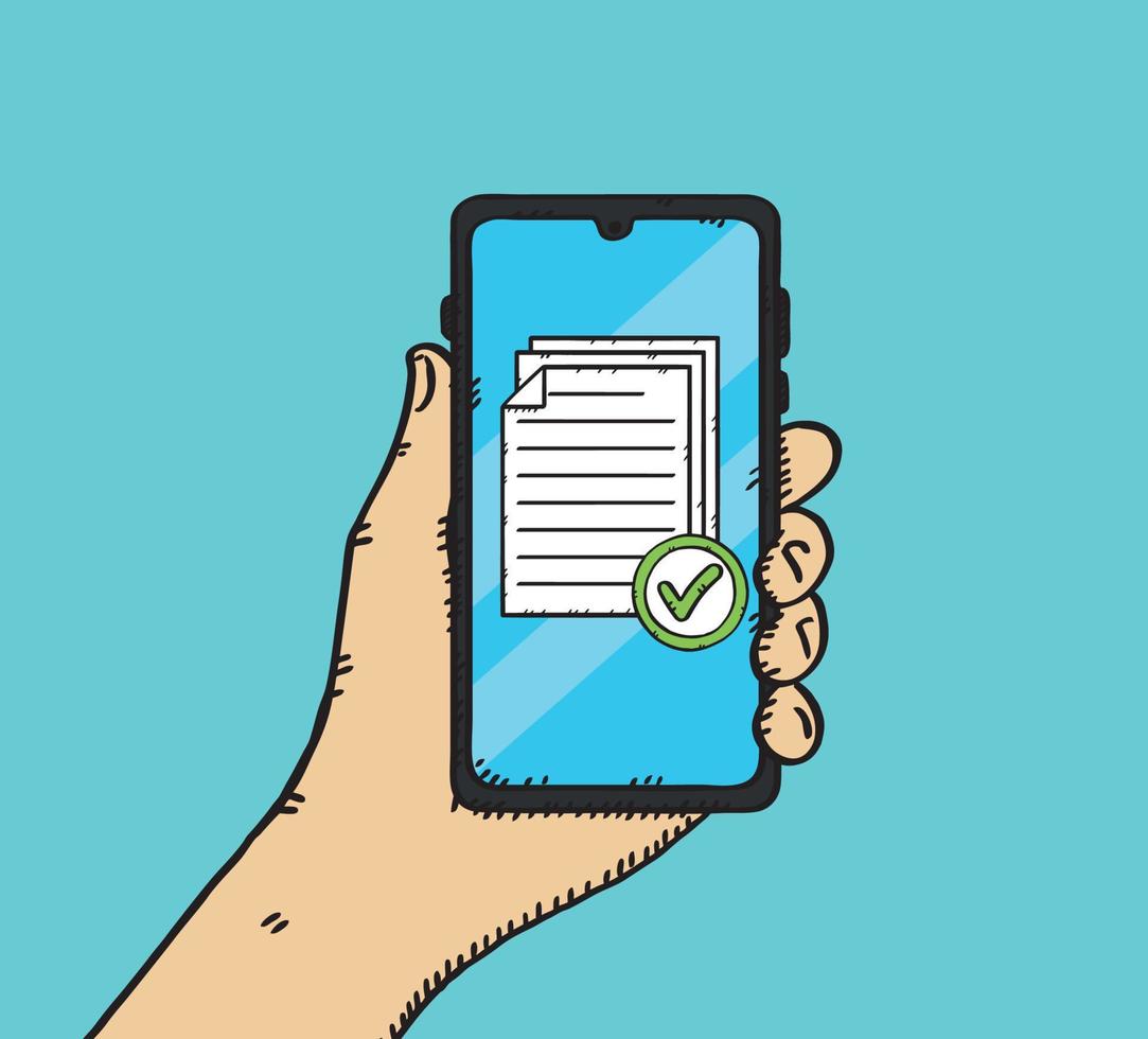 Icon of several documents with green checkmark showing on mobile screen. A passed test or survey. Hand drawn vector illustration. Pro Vector