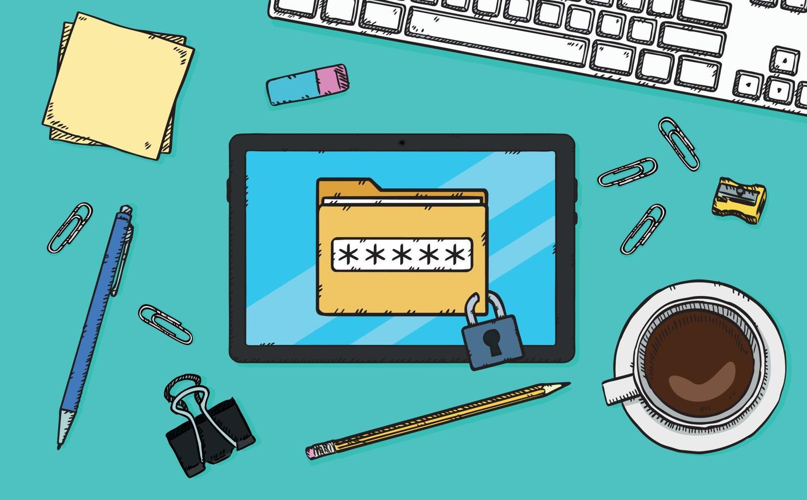 A password-protected folder file is displayed on the tablet's screen. The tablet is on a table in the office. Hand-drawn vector graphics. Pro Vector