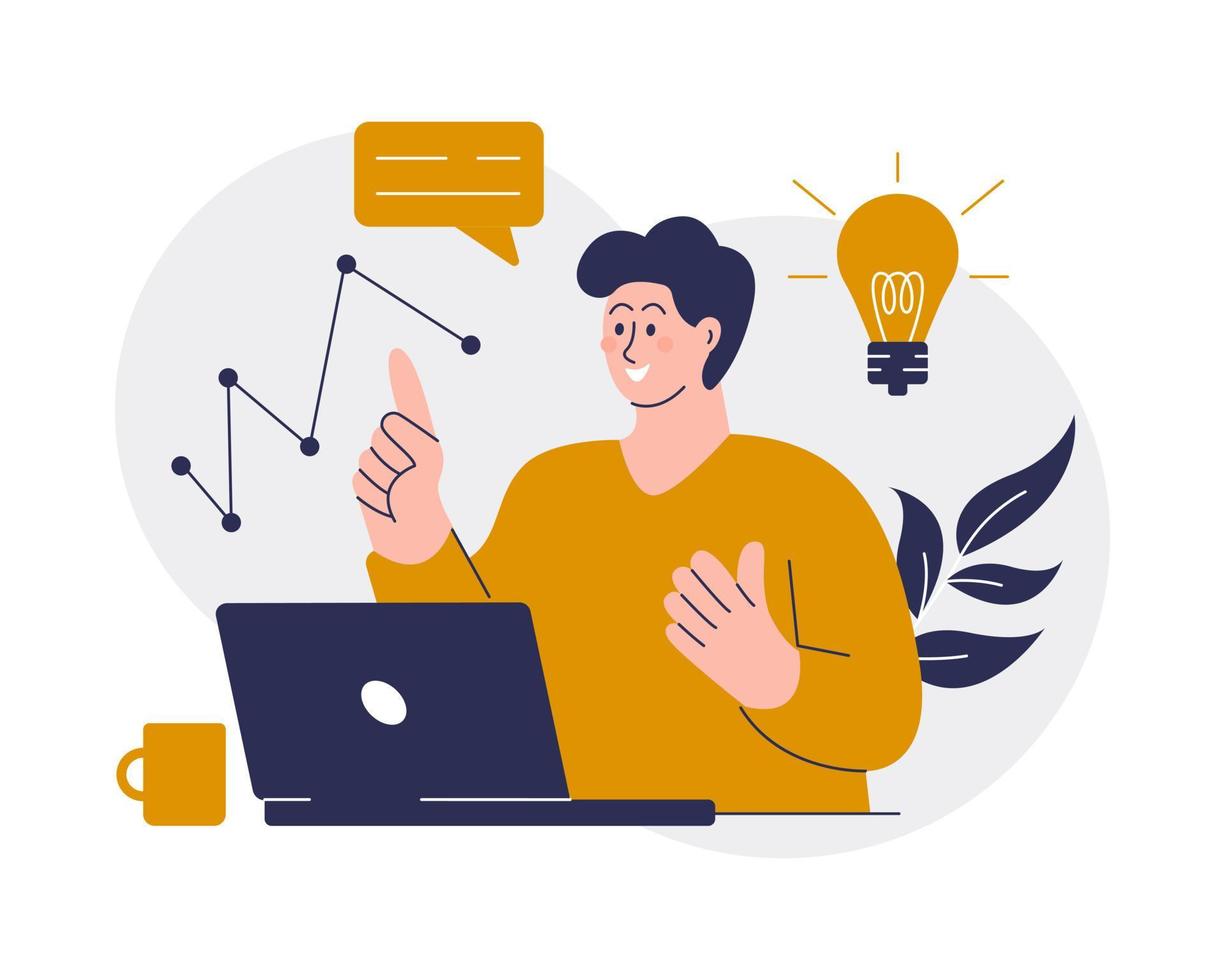 Business idea, planning strategy and solution concept. Business man, working on laptop, communicating with colleagues. Thinking and imagination, brainstorming, motivation and inspiration Pro Vector