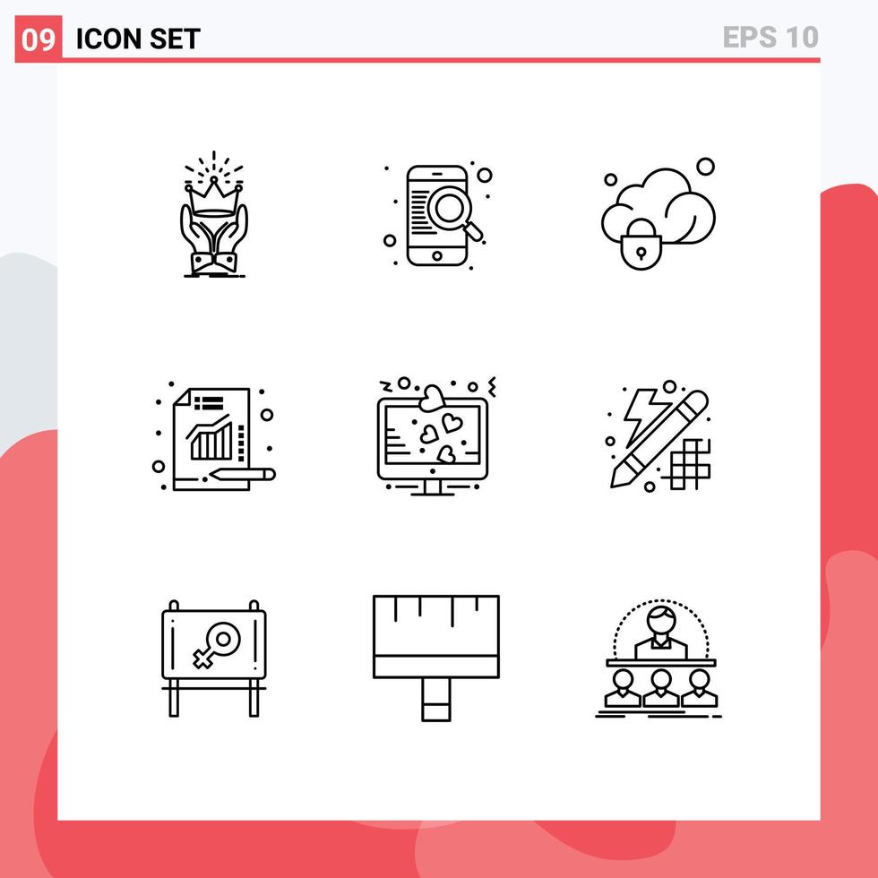 Pictogram Set of 9 Simple Outlines of display report online metrics secure Editable Vector Design Elements Free Vector