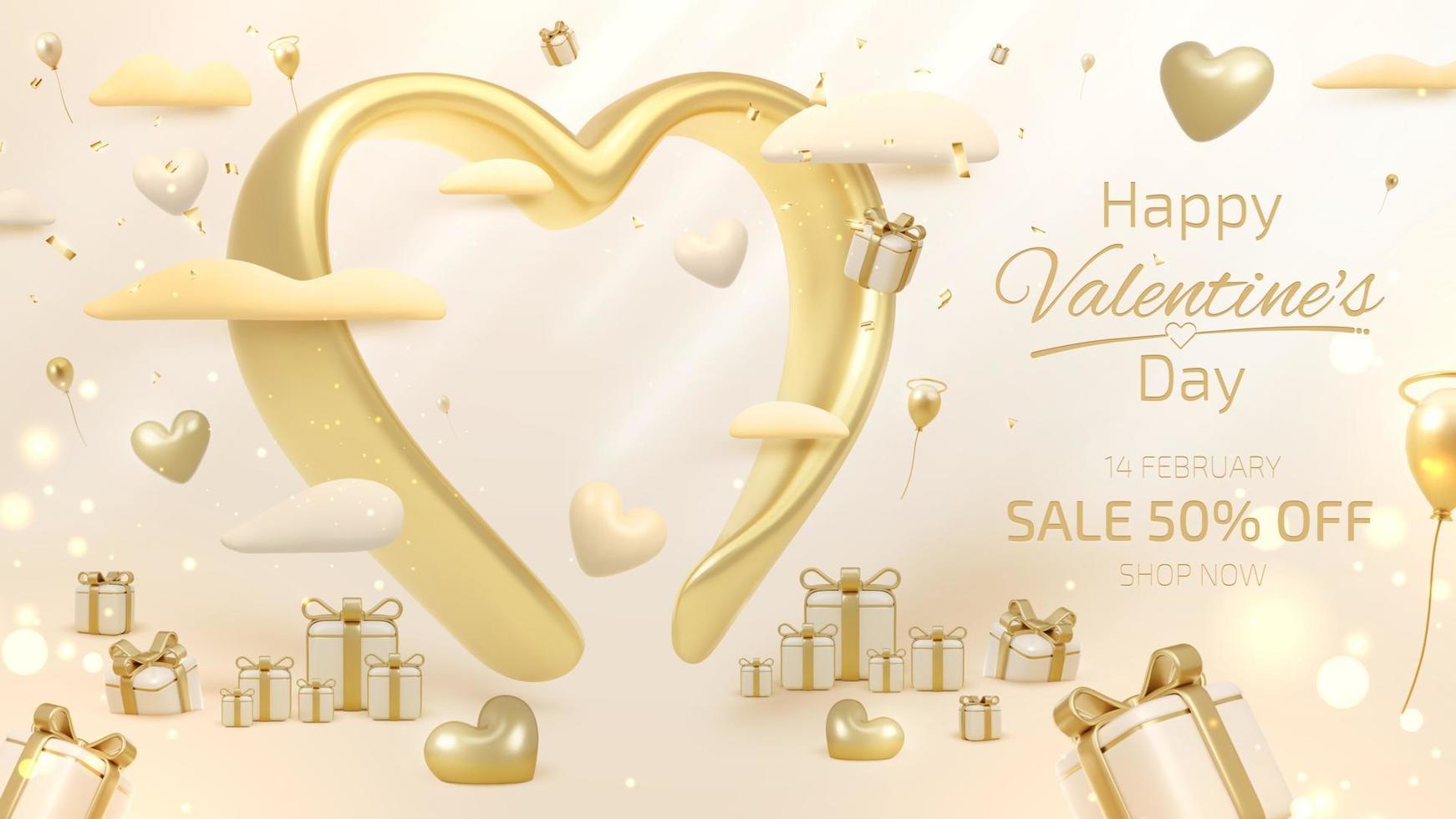Valentine day background with 3d heart shape elements and gift box with ribbon and light effect decorations and bokeh. Pro Vector