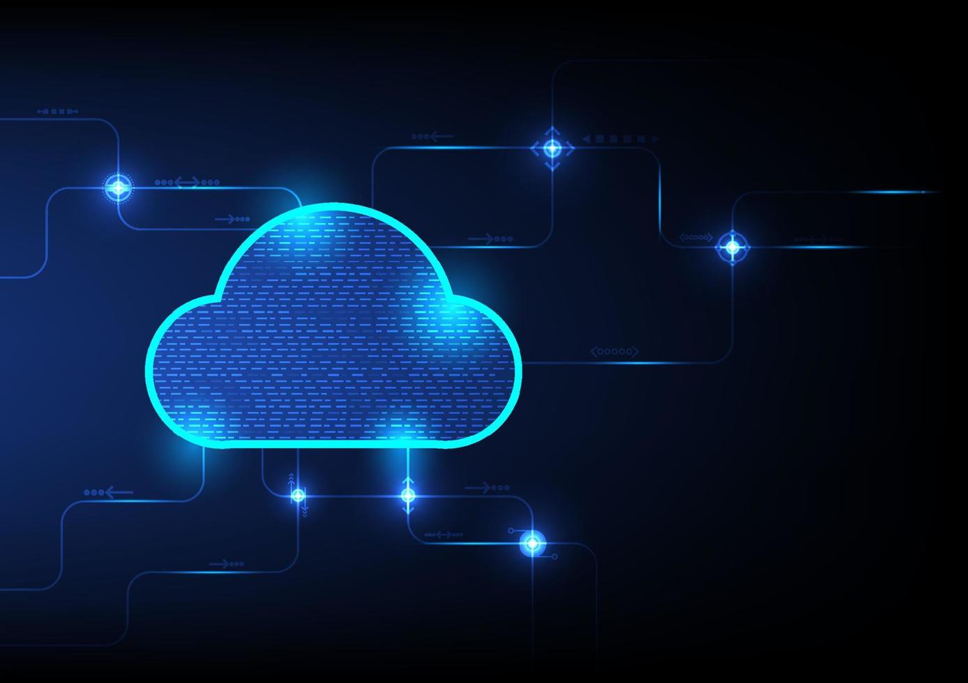 High-tech cloud computing system with networks and symbols that exchange data on a blue background. Pro Vector
