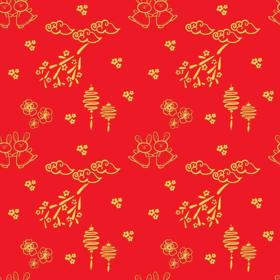Chinese pattern with gold line art characters, simple hand-drawn Asian elements on red background Pro Vector