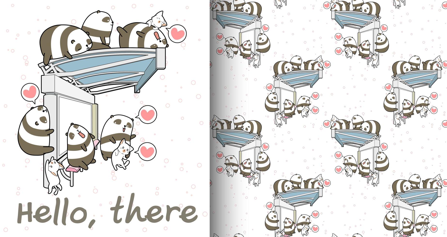 Kawaii panda and cat characters wait for bus pattern Pro Vector