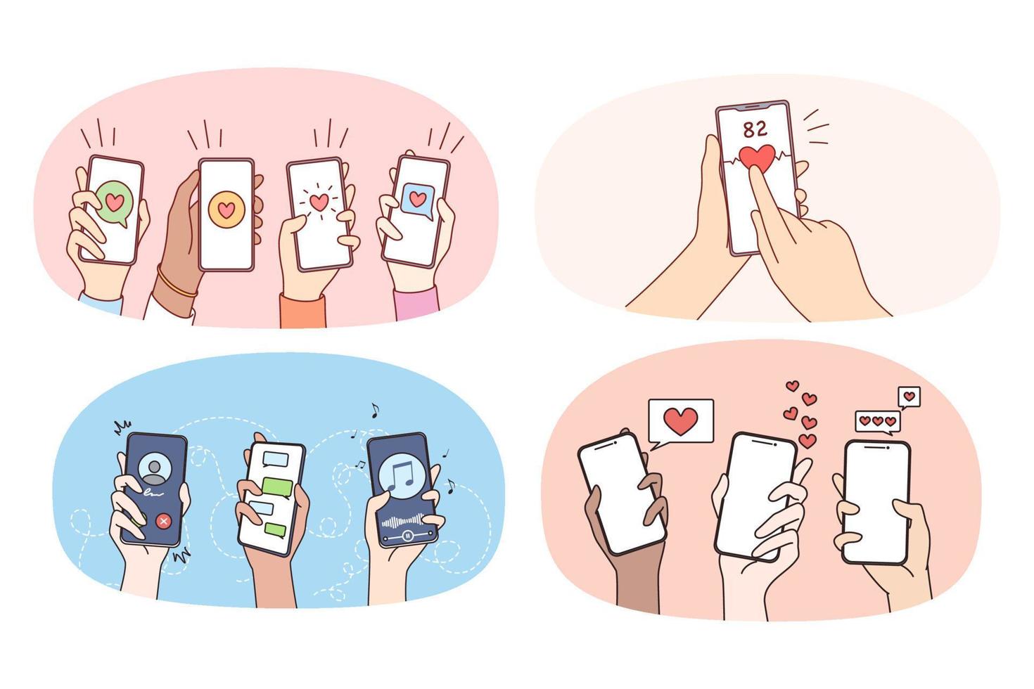 Set of people hold smartphones in hands text and message online on device. Collection of humans use cellphones internet applications. Communication and technology. Vector illustration. Pro Vector