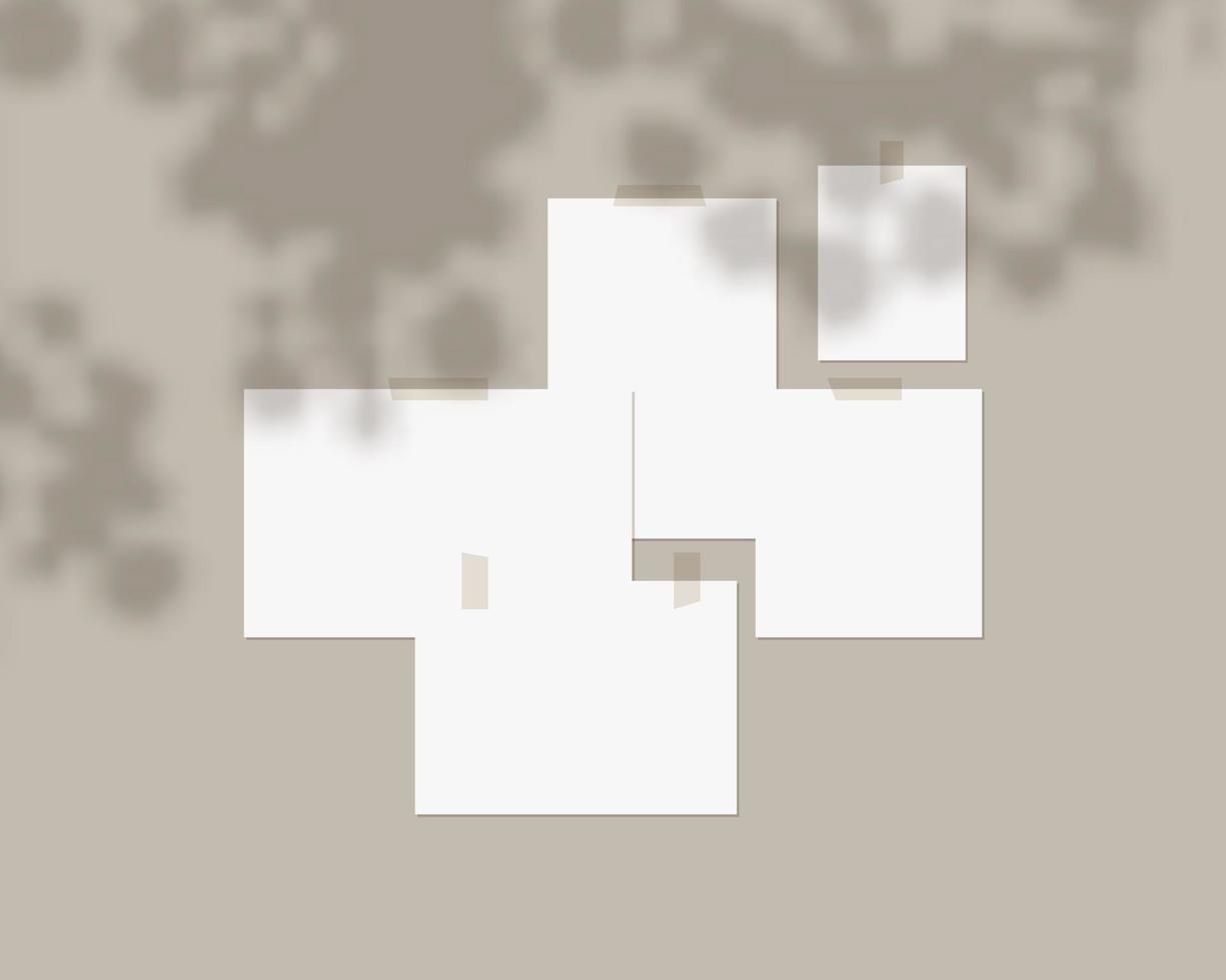 Mood board mockup template. Empty sheets of white paper on the wall with shadow overlay. Mockup vector isolated. Template design. Realistic vector illustration. Pro Vector