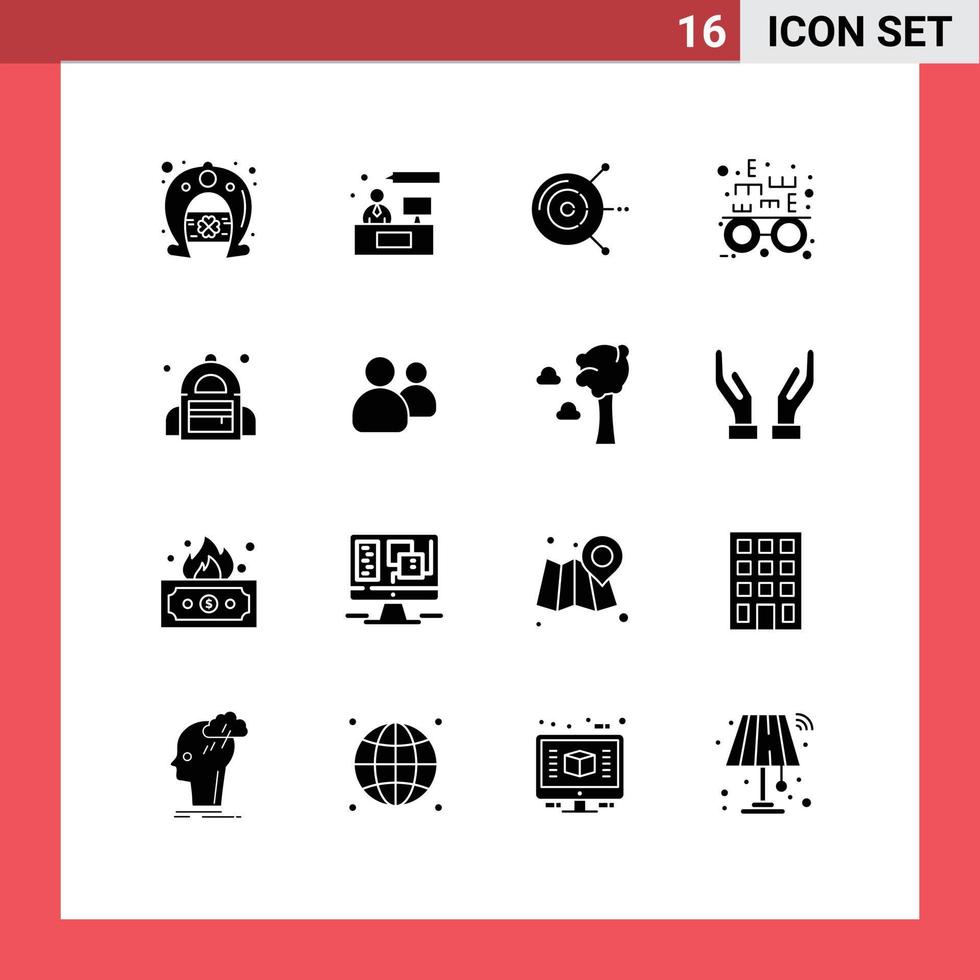 Set of 16 Vector Solid Glyphs on Grid for student bag computer optical eye test Editable Vector Design Elements Free Vector